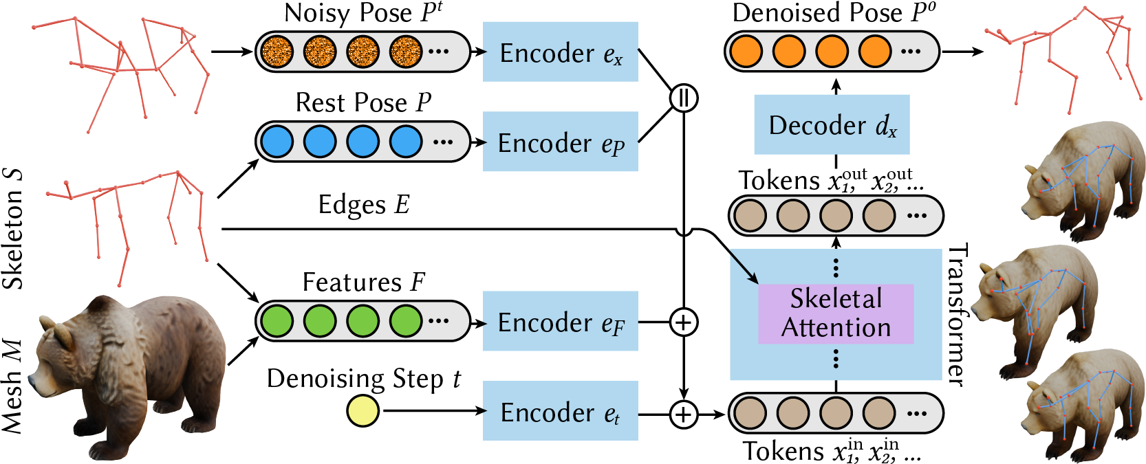Learning a pose space. We train a diffusion model to denoise poses conditioned on the mesh, skeleton edges, rest pose, and semantic node features. Sampling uses a standard denoising schedule.
